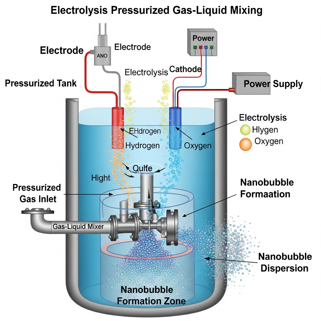 Pressurized Gas–Liquid Mixing is essentially a mass-transfer acceleration process engineered to force gas into water under controlled pressure, then rapidly release that pressure to trigger nanobubble nucleation. It’s predictable, scalable, and easy to integrate into industrial infrastructure.