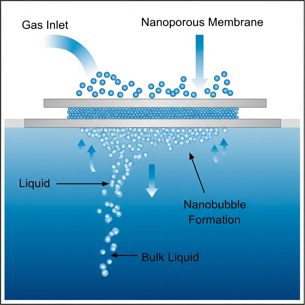 - Pure or blended gases (air, O₂, CO₂, H₂, or ozone) are fed into a pressurized chamber beneath a hydrophobic or hydrophilic nanoporous membrane.
